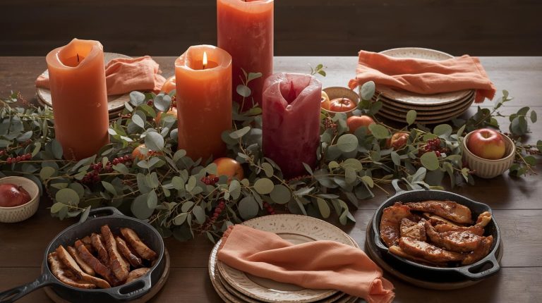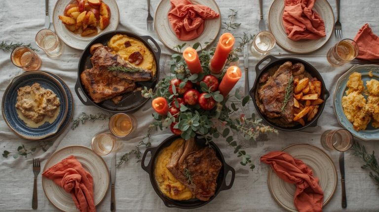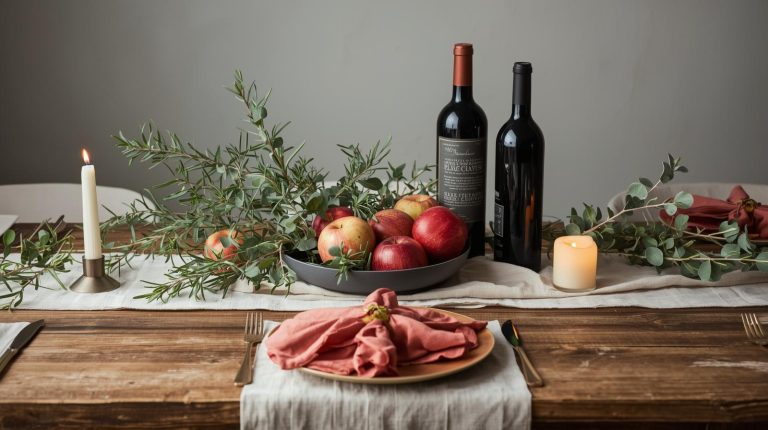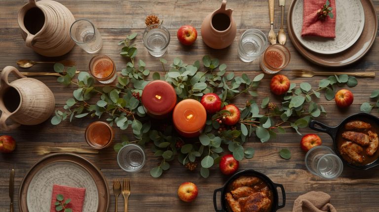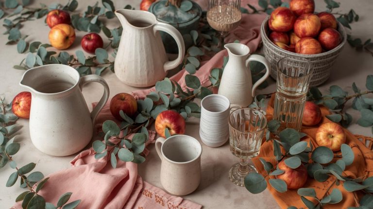 The glassware on your table should feel just as warm and inviting as the food itself, blending rustic comfort with a touch of elegance. For our table, I love using a beautiful glass decanter to serve wine, it just makes it feel so special. A large, elegant glass jug with a slightly vintage feel is also perfect for infused water or cider, as the transparency of the glass lets the color of the drinks add to the decor. When I serve red wine, I choose simple stemmed glasses that don’t distract from the wine itself. And for cold water or cider, I use simple, clear tumblers with a subtle texture. I love adding ice cubes and a sprig of rosemary or a cinnamon stick to each glass for a beautiful garnish that ties it all together.