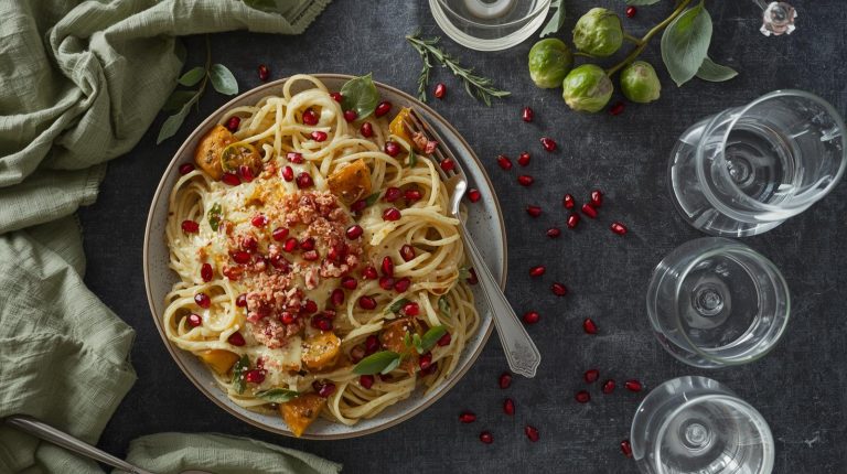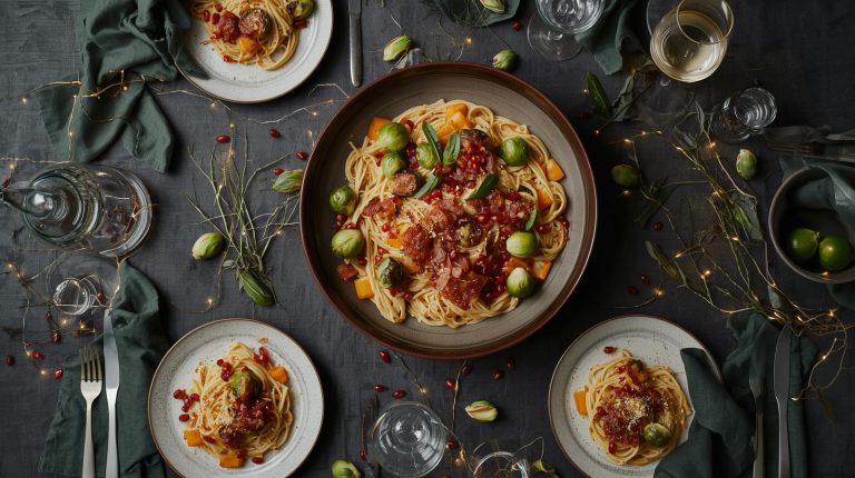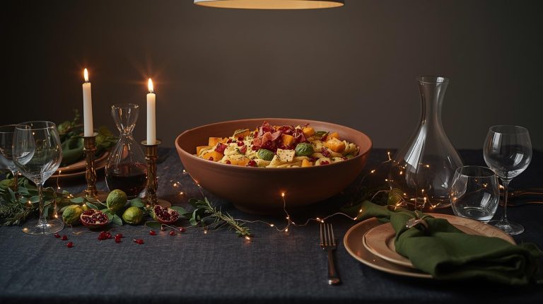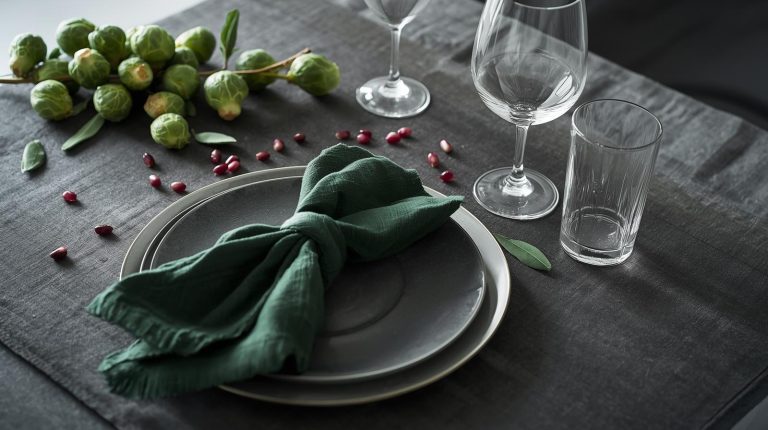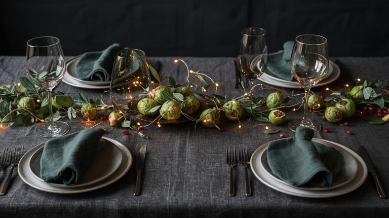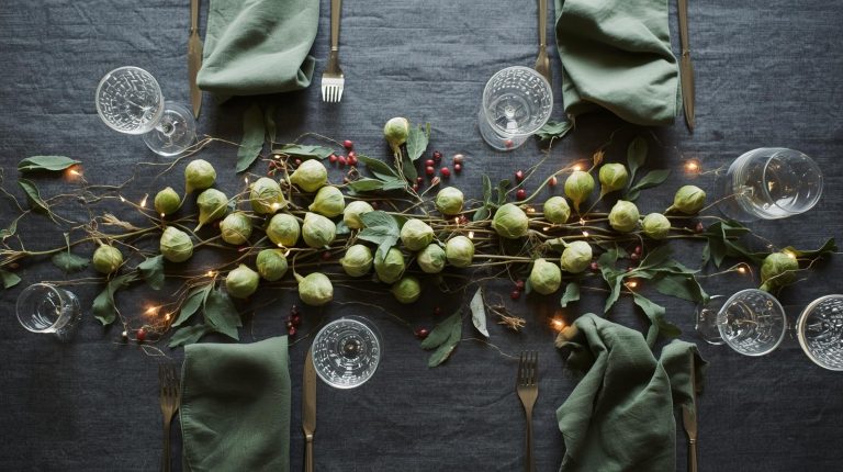 The centerpiece should feel like it was born from the meal itself. I create a simple arrangement of whole Brussels sprouts scatter a handful of fresh pomegranate seeds and a few leaves of sage or rosemary across the table. This brings the colors and textures of the dish directly to the table decor, creating a beautiful and authentic feel.