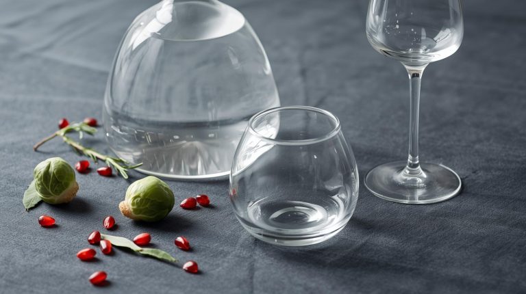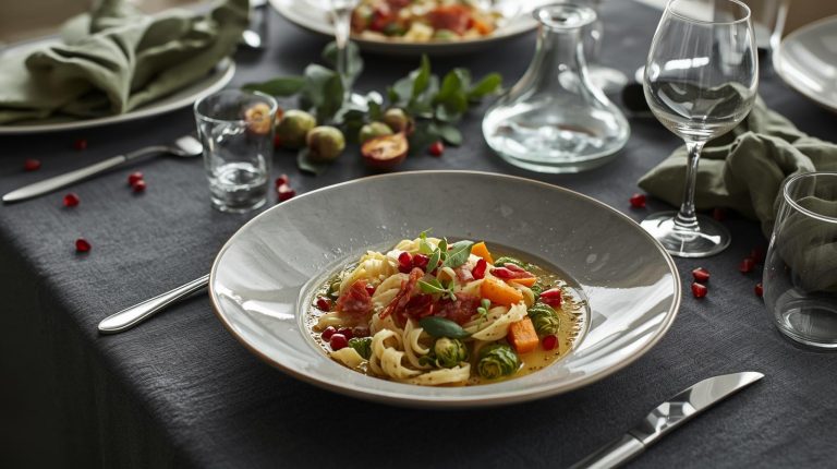 Start with a base that is both simple and elegant. I love a deep charcoal gray tablecloth which will provide a beautiful, sophisticated backdrop that makes the creamy pasta and rich colors of the vegetables stand out. For the napkins, use a soft linen in a deep green that complements the dish. I’ll present them simply, either with a clean, flat fold or a gentle roll, placed neatly on the plates. The glassware should also feel elegant and refined. For wine, use a simple, stemmed glass with a delicate bowl. For water, choose a sleek, modern tumbler with clean lines. The simplicity of the glassware will allow the light to play beautifully across the table and not distract from the meal.