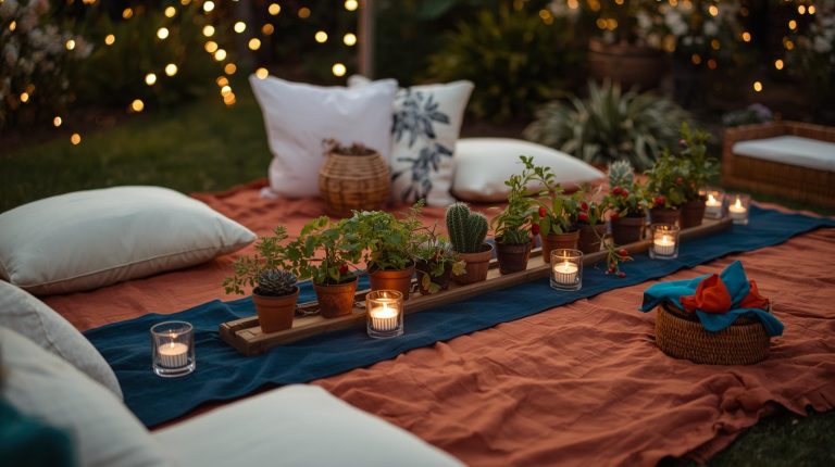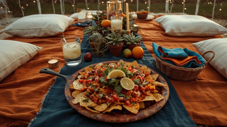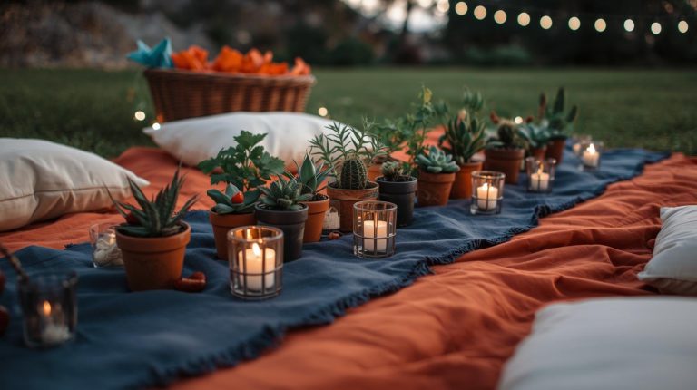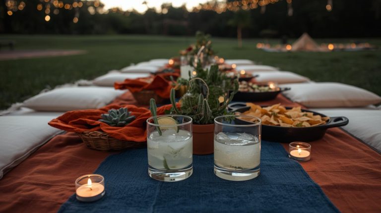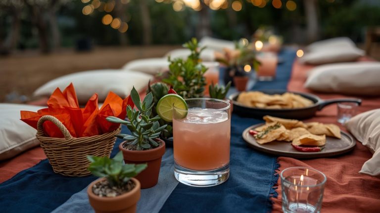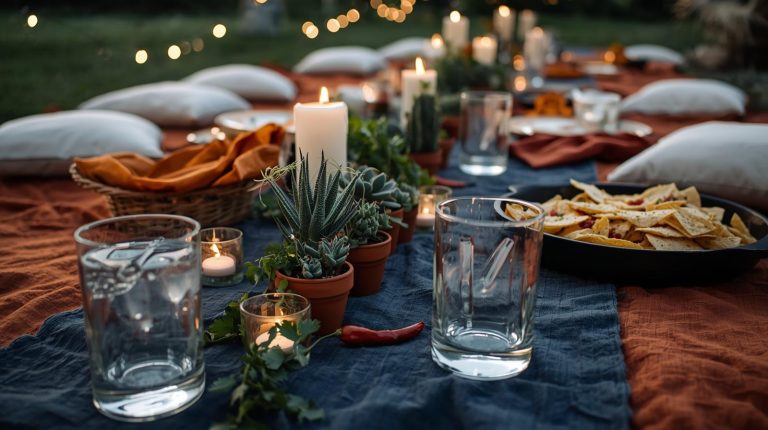 For the lighting. As the sun goes down, the ambiance comes from a soft, magical glow. Hang strings of warm, white fairy lights and small lanterns above the table. On the table itself, use small, simple candles in clear glass holders to add a flickering, intimate light. For the glassware. For drinks, use simple, heavy based tumblers for refreshing margaritas or icy lemonade. For the napkins & utensils. I go for napkins in a vibrant, unexpected color like a fiery orange, and place them in a small wicker basket for a casual, effortless feel.