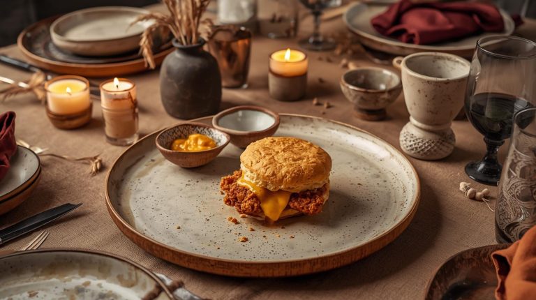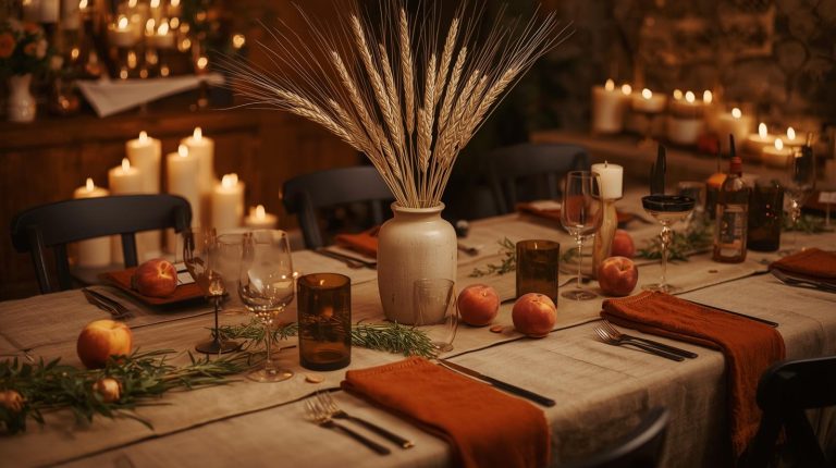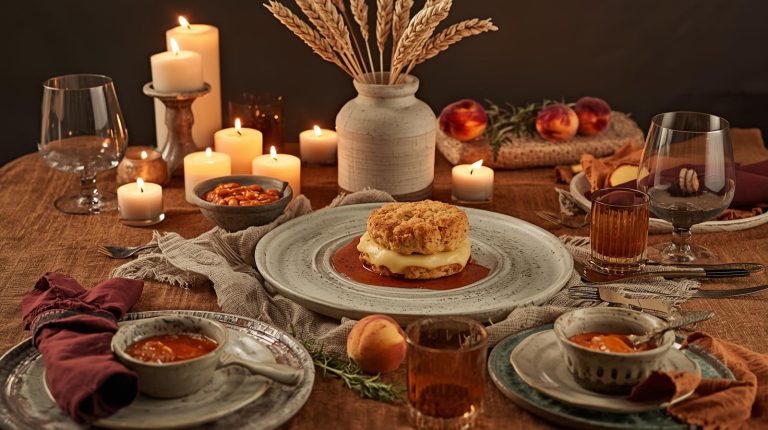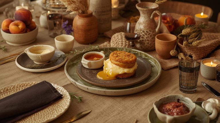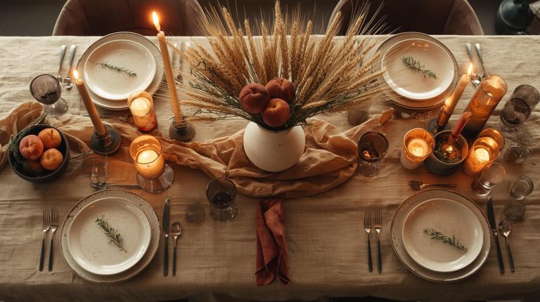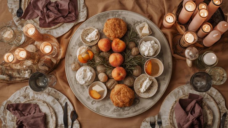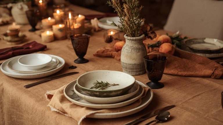 Start with a base that feels rich and inviting. A simple, natural wooden tabletop or a rustic linen tablecloth in a warm, muted camel or terracotta color that will provide the perfect backdrop. The plates should be a collection of mismatched, handmade ceramic dishes in earthy tones like off white, light gray, or moss green, each with a unique, organic feel.